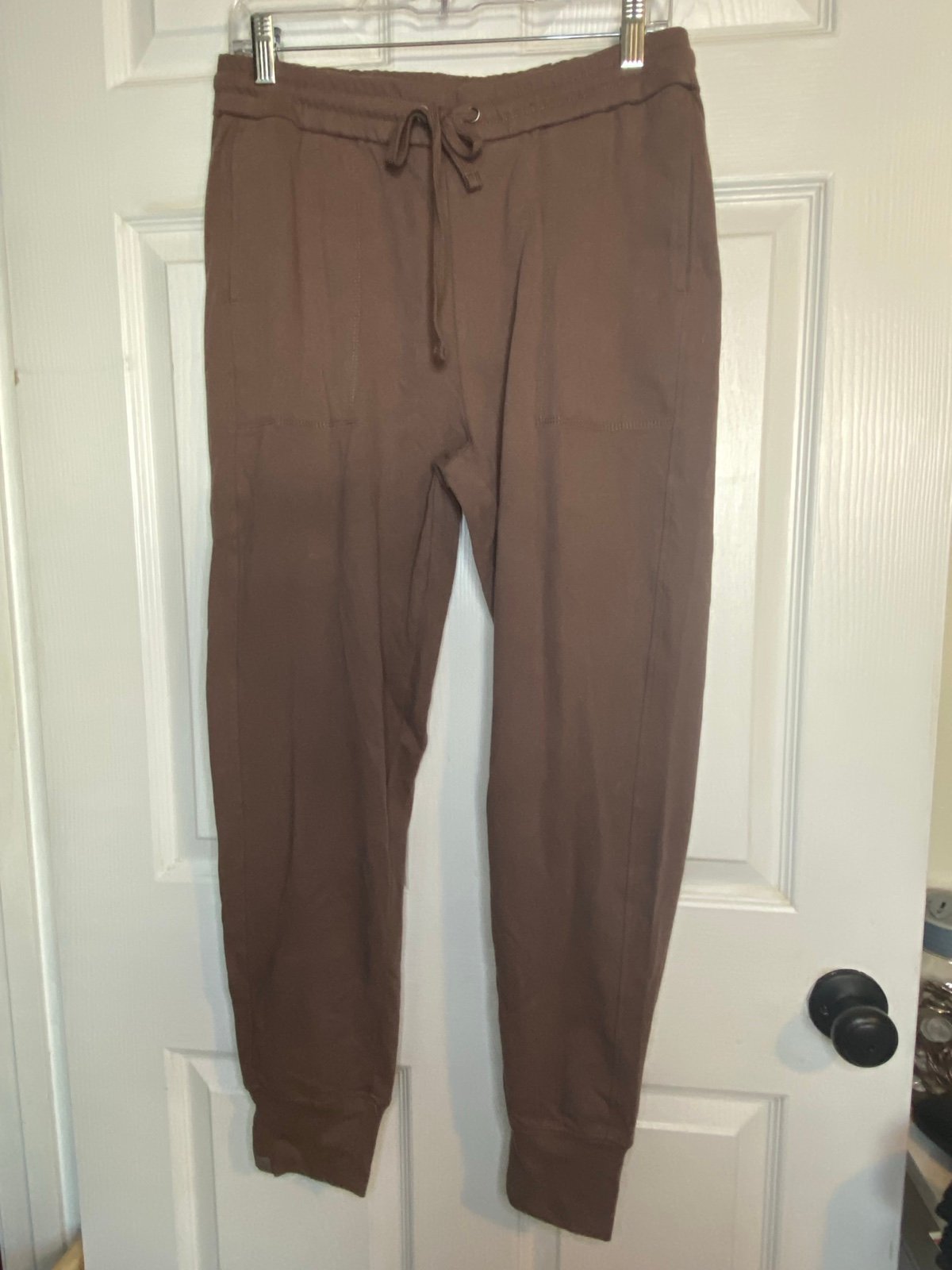 These joggers are very soft and lightweight. They are a sable/brown color. They have two front pockets and two back pockets. Back pockets still have the stitches. They are new with tags. Waist 31” length 27.5” approximately. Size medium. Cuffs at bottom. Malibu collection.
