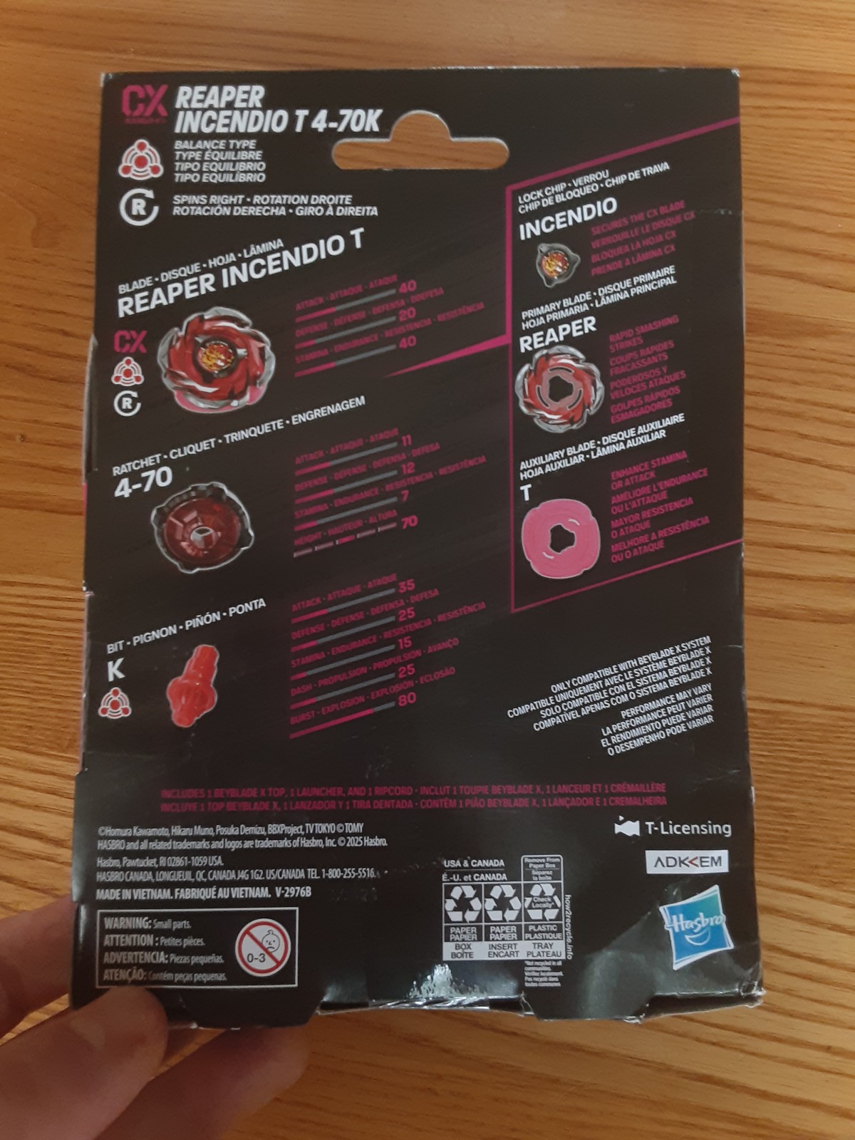 You receive 1 New in Box REAPER INCENDIO T 4-70 K (launcher included). This is from the CX Line, so the bey is 5 pieces compared to 3. This is the US release by Hasbro.