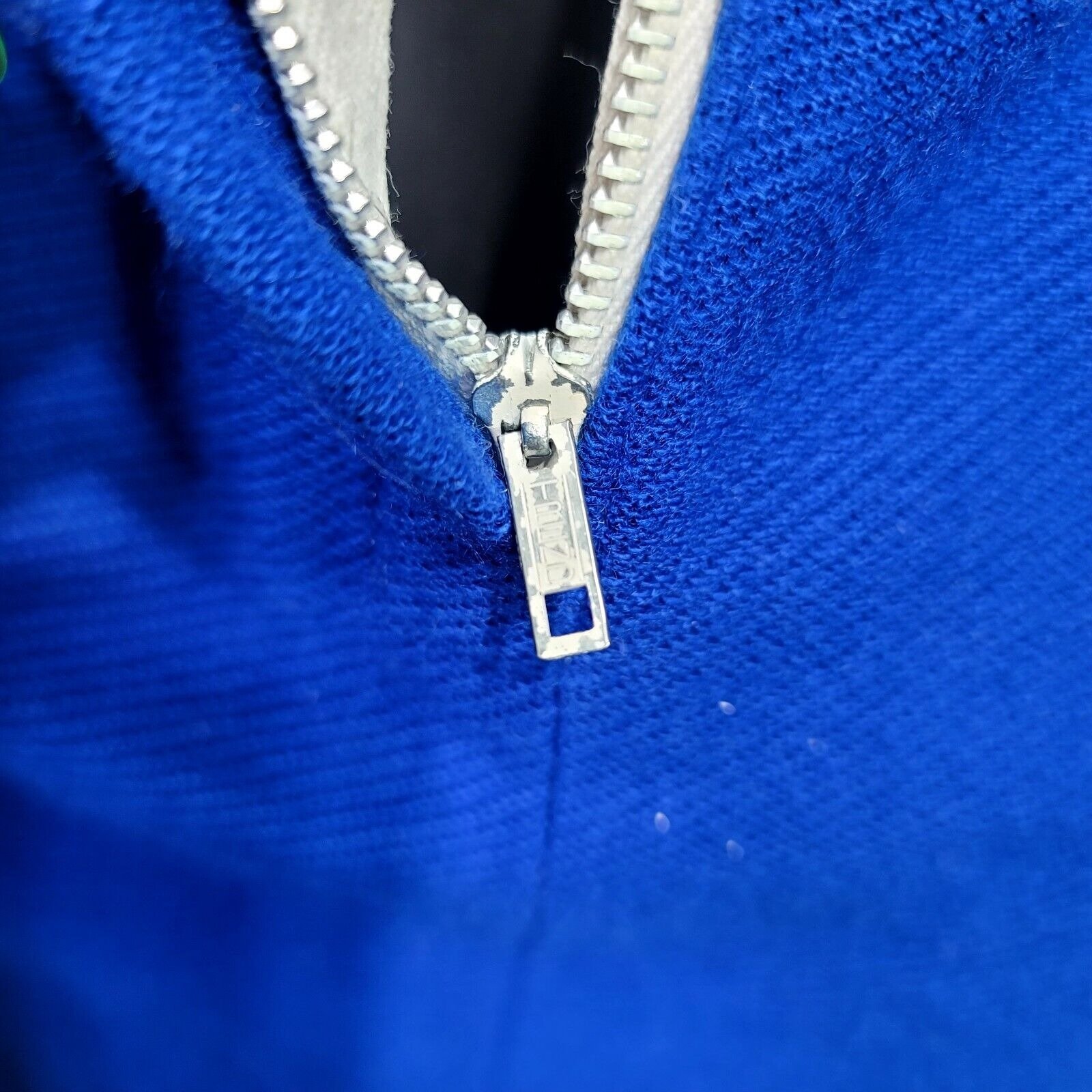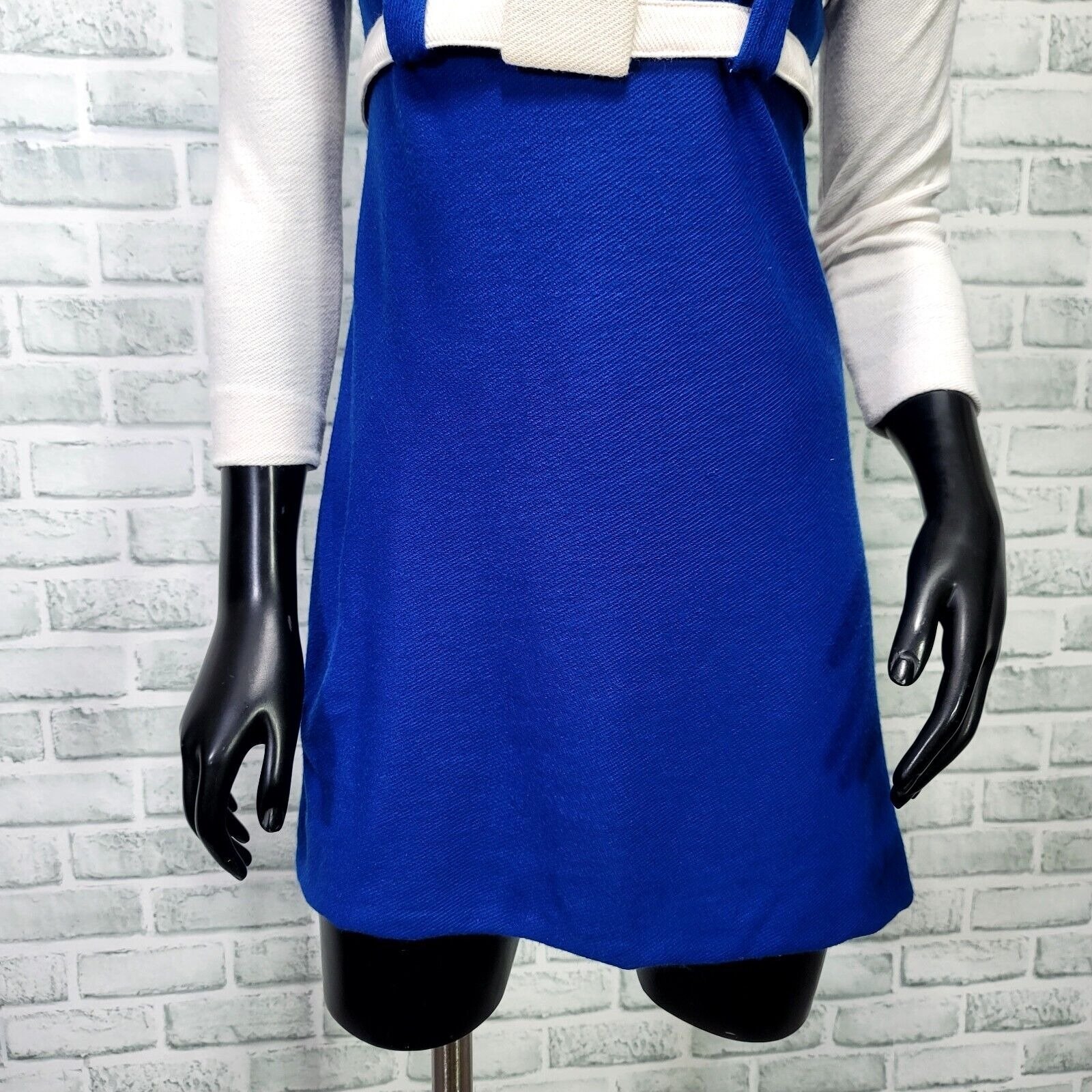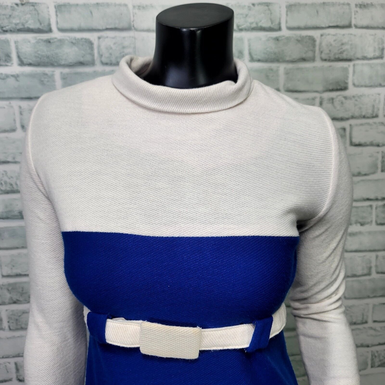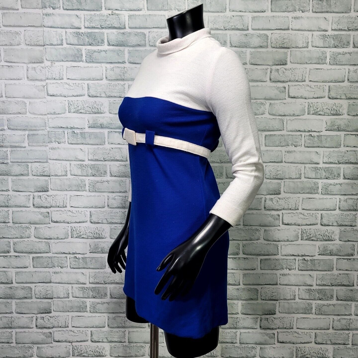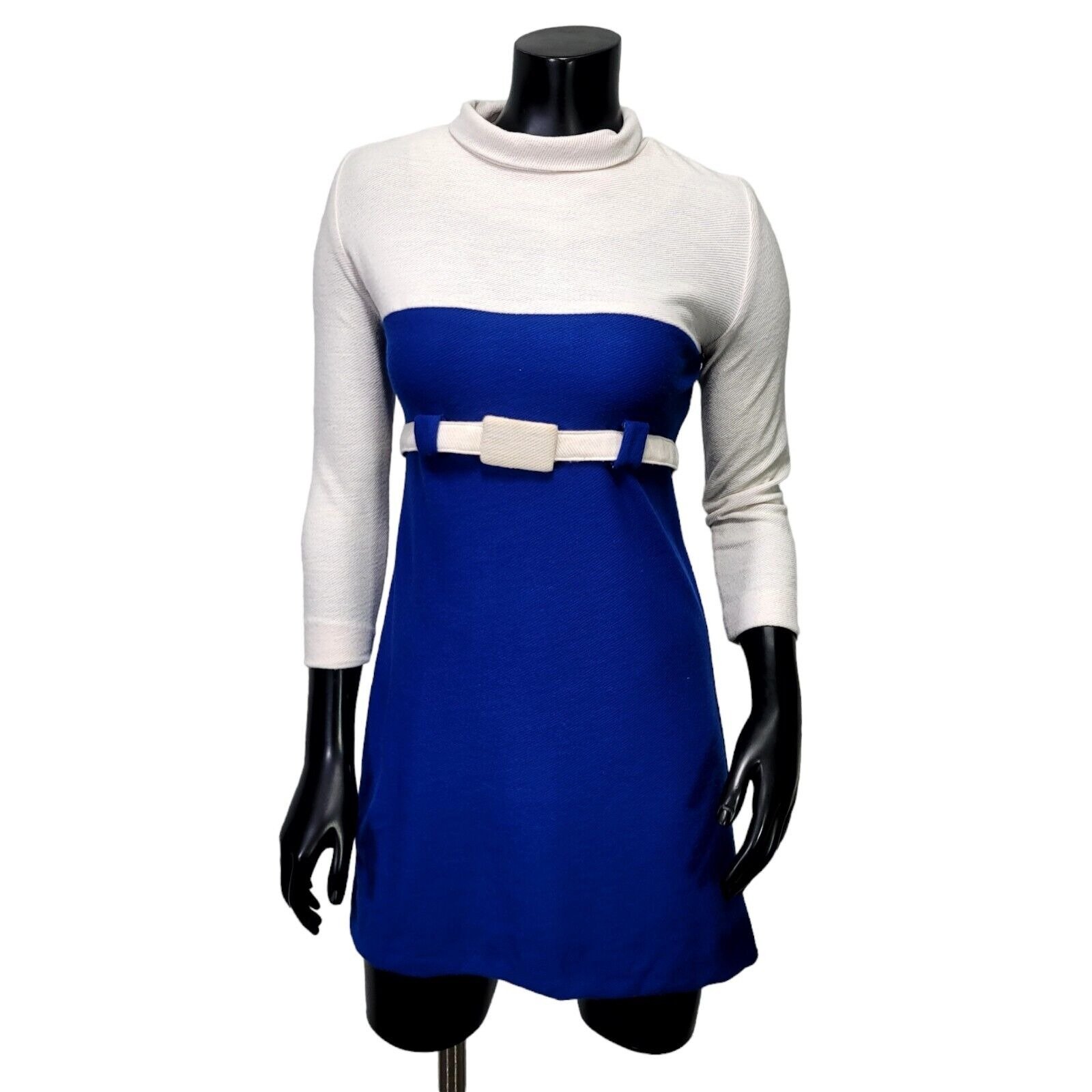A striking vintage 1960s Union made mod mini Twiggy dress, featuring a bold color-blocked design with a bright blue A-line skirt and a contrasting white mock neck top. The micro mini dress is accented with 3/4 sleeves, fold over mock neck and a matching white belt that cinches at the waist, adding definition to the silhouette. A perfect choice for retro-themed parties, vintage fashion events, or adding a unique touch to your everyday wardrobe.