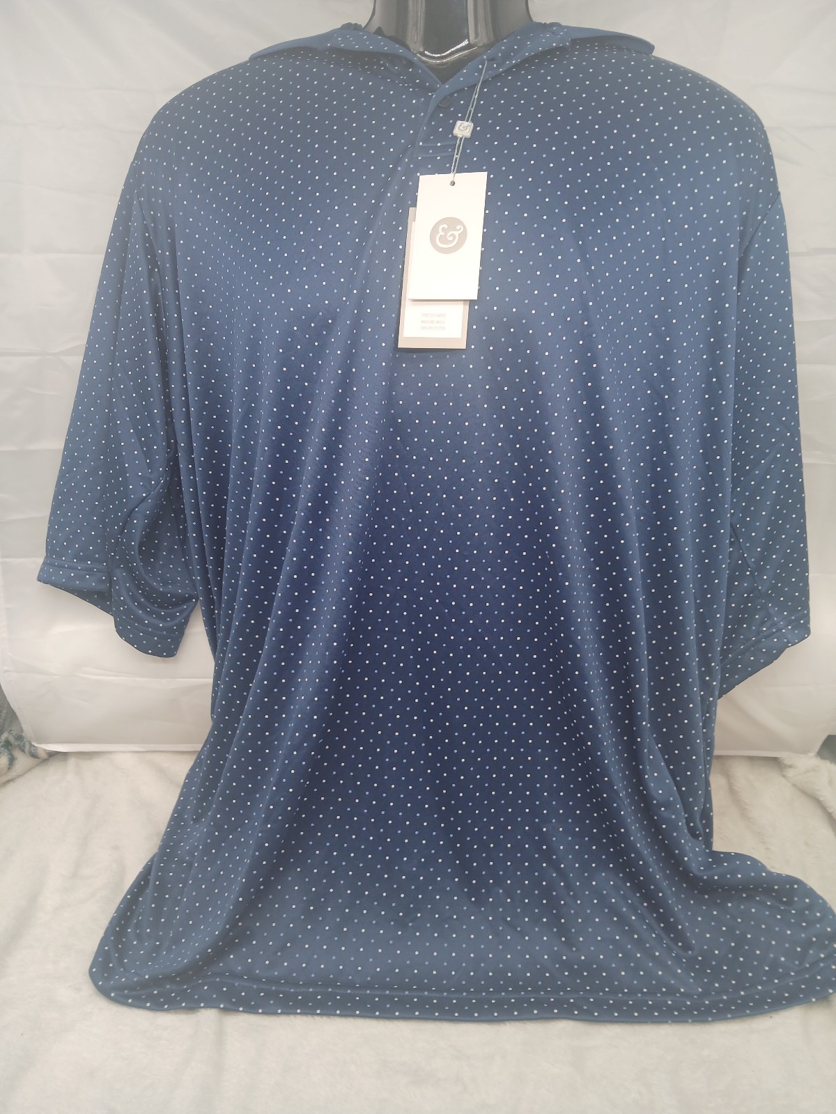 The Kilburne & Finch Blue Men S/S Golf Performance Polka Dot Polo in size 3XL is a stylish and functional addition to any man's wardrobe. Made from 100% polyester microfiber, this collared polo features a button closure and short sleeves, perfect for a relaxed fit on the golf course. The polka dot pattern adds a fun and unique touch, while the dark blue color and cutaway collar give it a sophisticated look. With its machine washable design and size tailored for big and tall men, this polo from Kilburne and Finch is both practical and fashionable for any occasion.