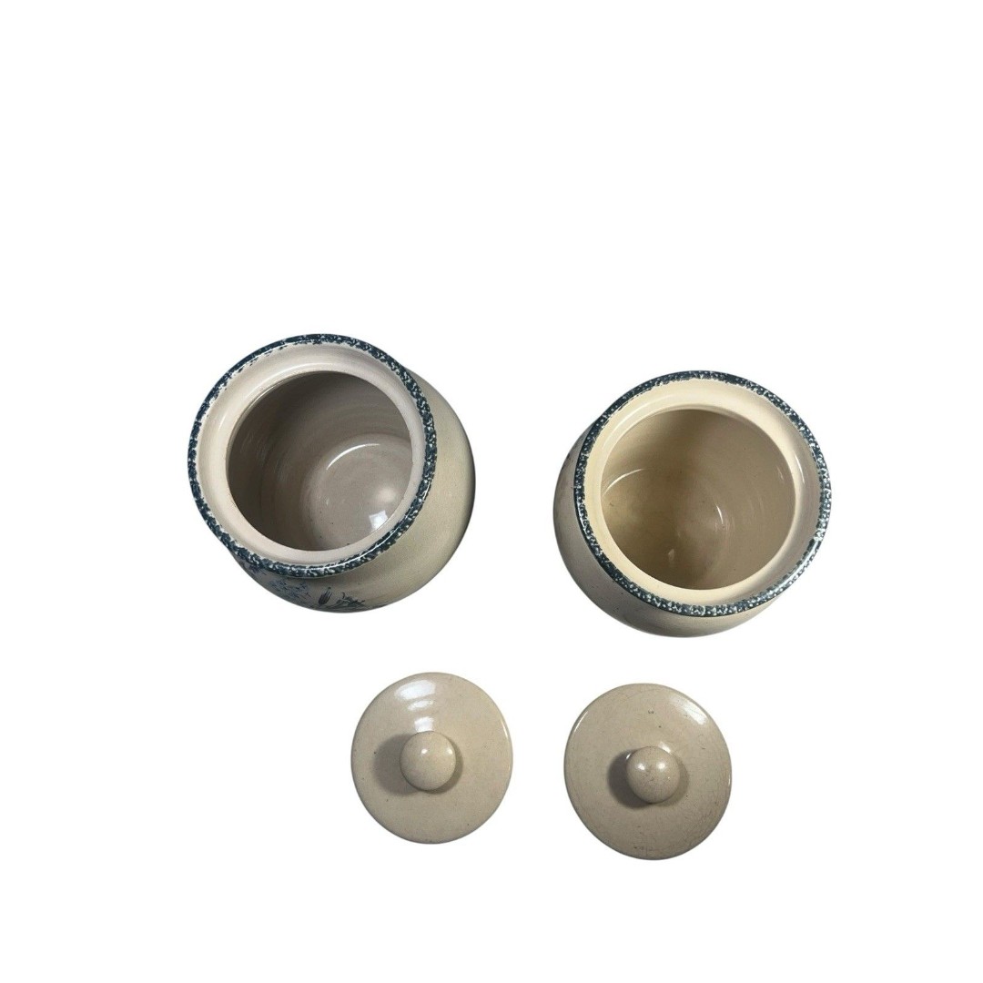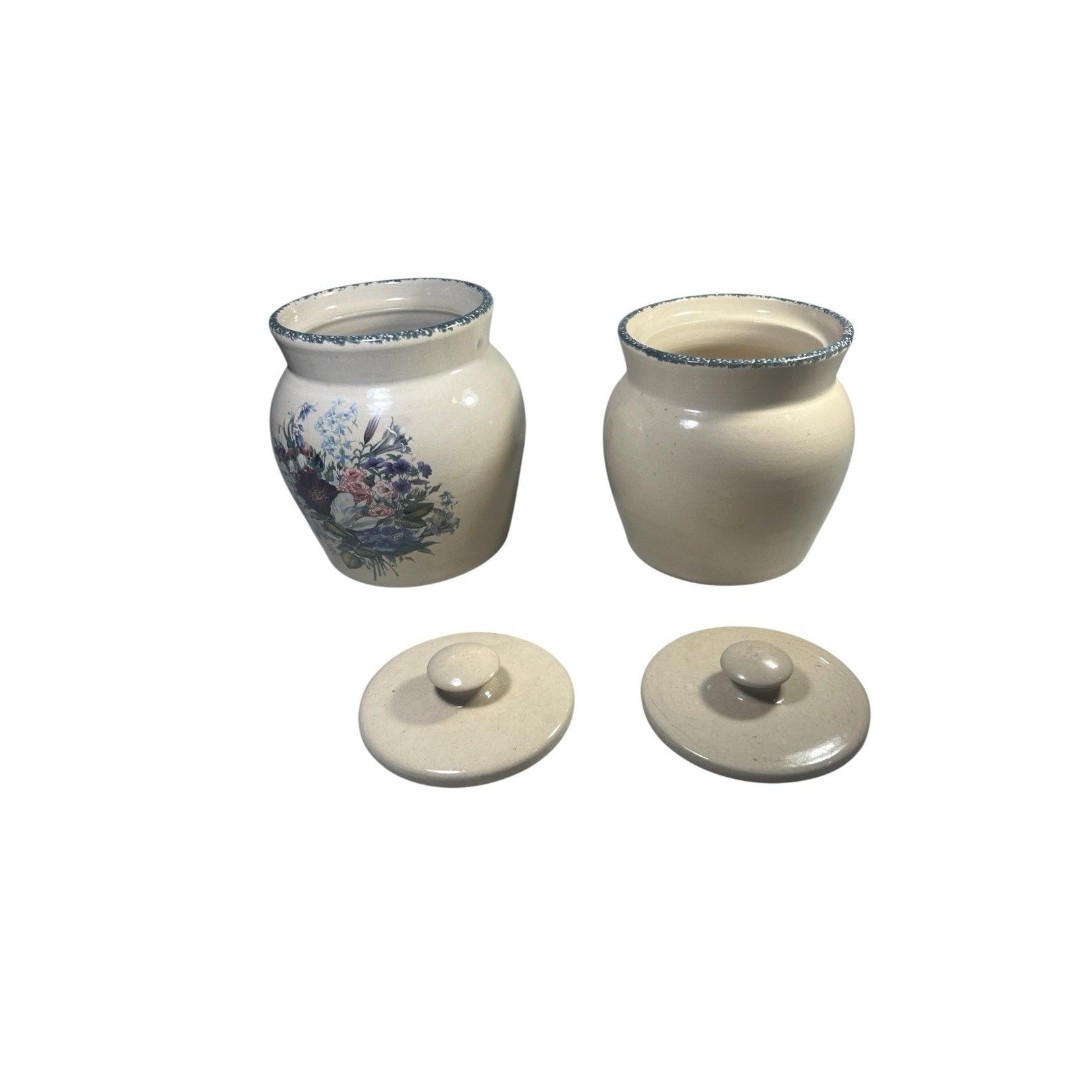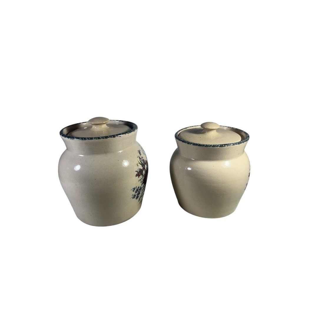 Preowned vintage set of two Casey Pottery canisters from Marshall, Texas, featuring a charming Wild Flowers Blue Sponge design. These pieces showcase a beautiful floral pattern with minor wear from use, including slight discoloration and light crazing in some areas. Both canisters are in excellent condition with no chips or cracks. Dimensions: one measures 7.5 tall, the other 6.75 tall.