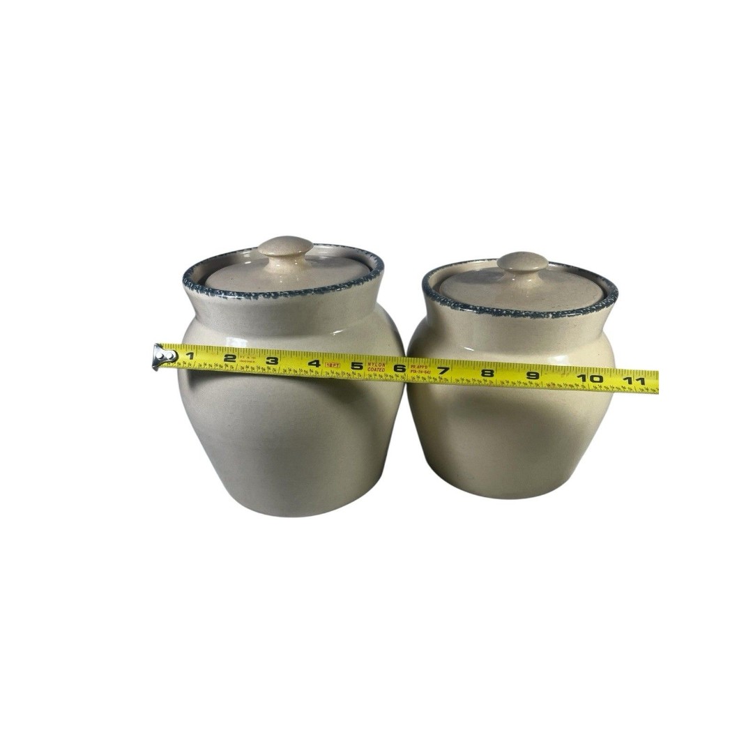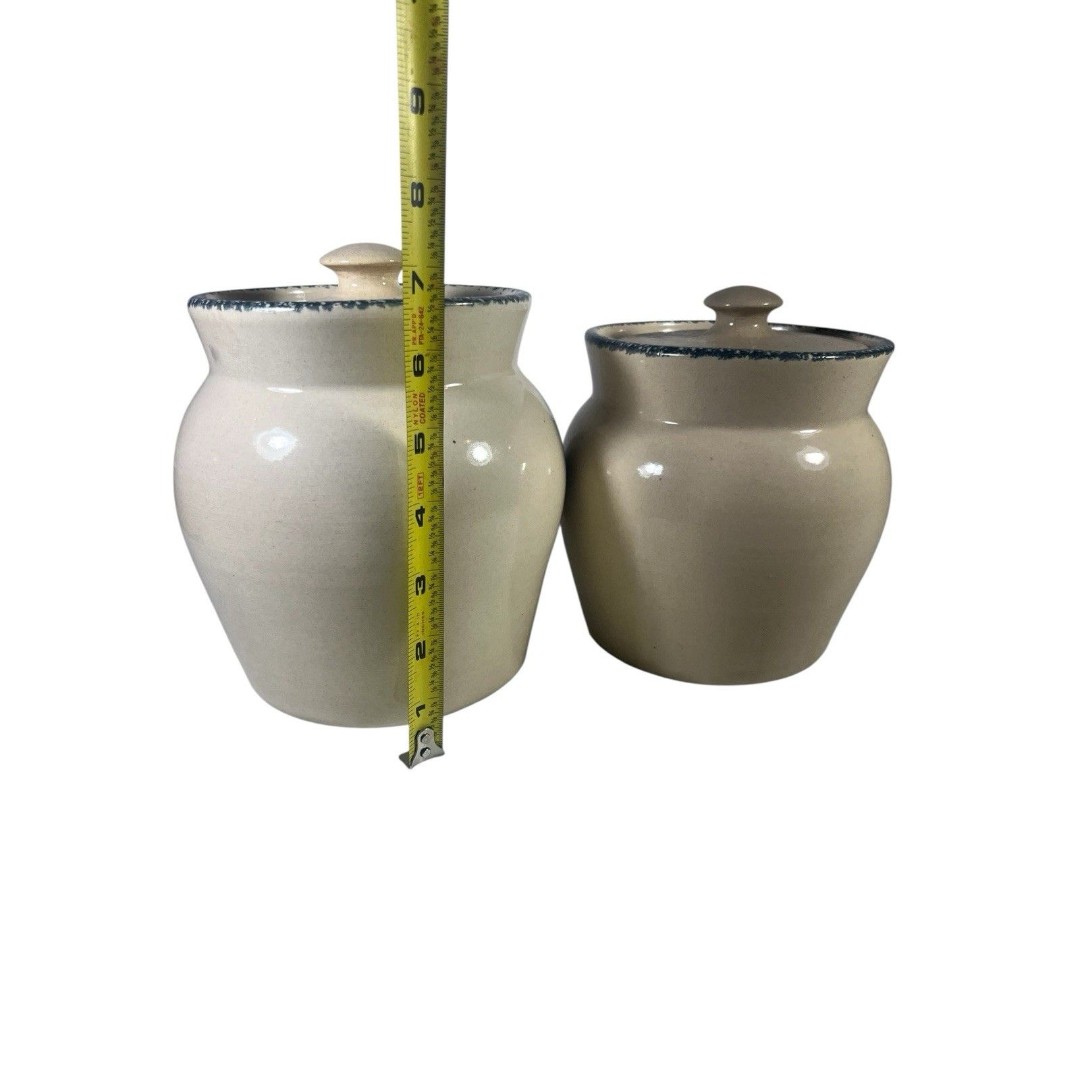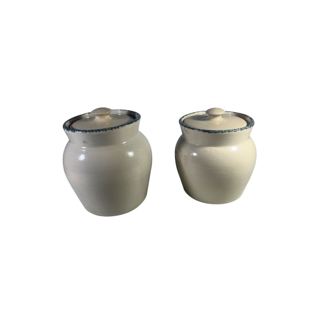 Preowned vintage set of two Casey Pottery canisters from Marshall, Texas, featuring a charming Wild Flowers Blue Sponge design. These pieces showcase a beautiful floral pattern with minor wear from use, including slight discoloration and light crazing in some areas. Both canisters are in excellent condition with no chips or cracks. Dimensions: one measures 7.5 tall, the other 6.75 tall.