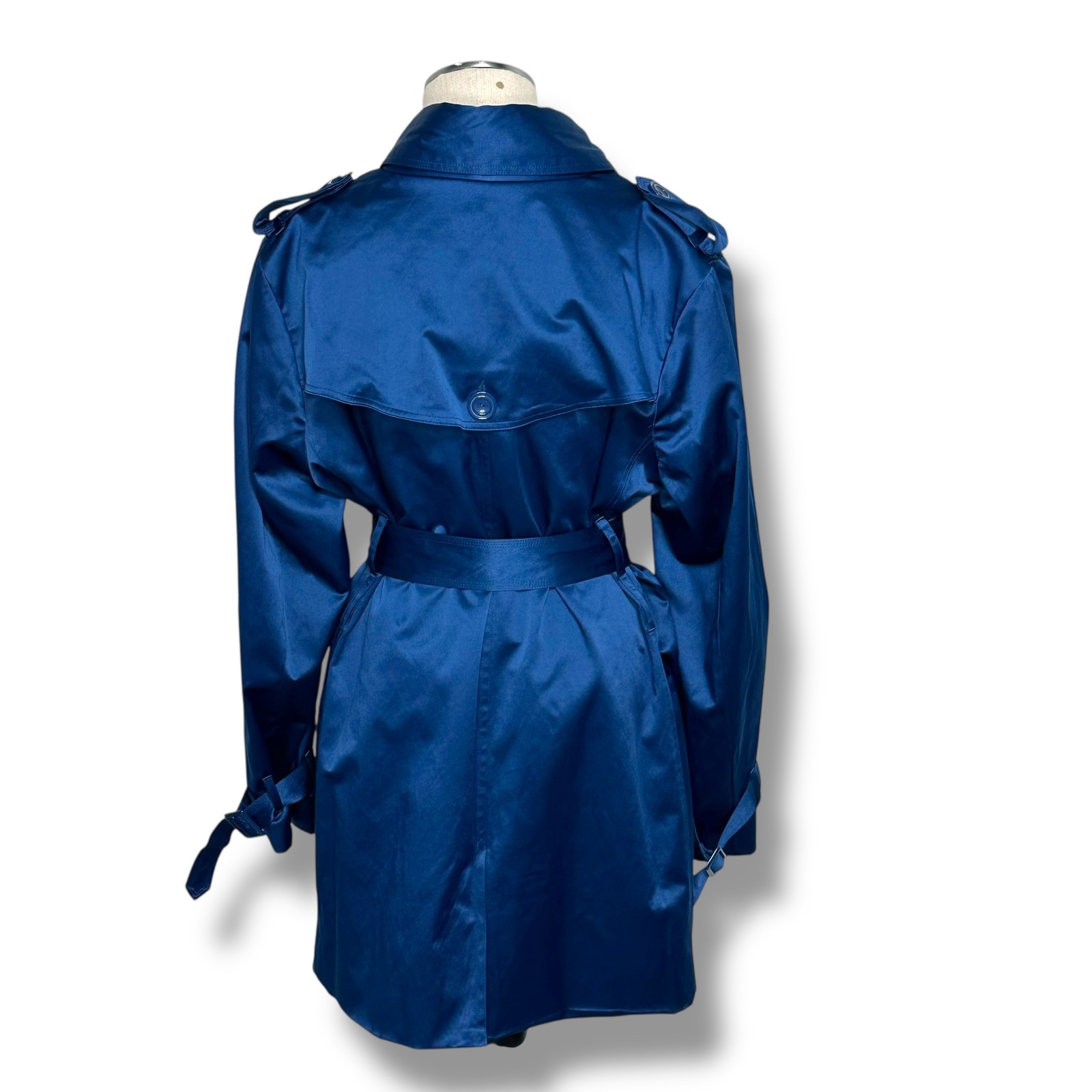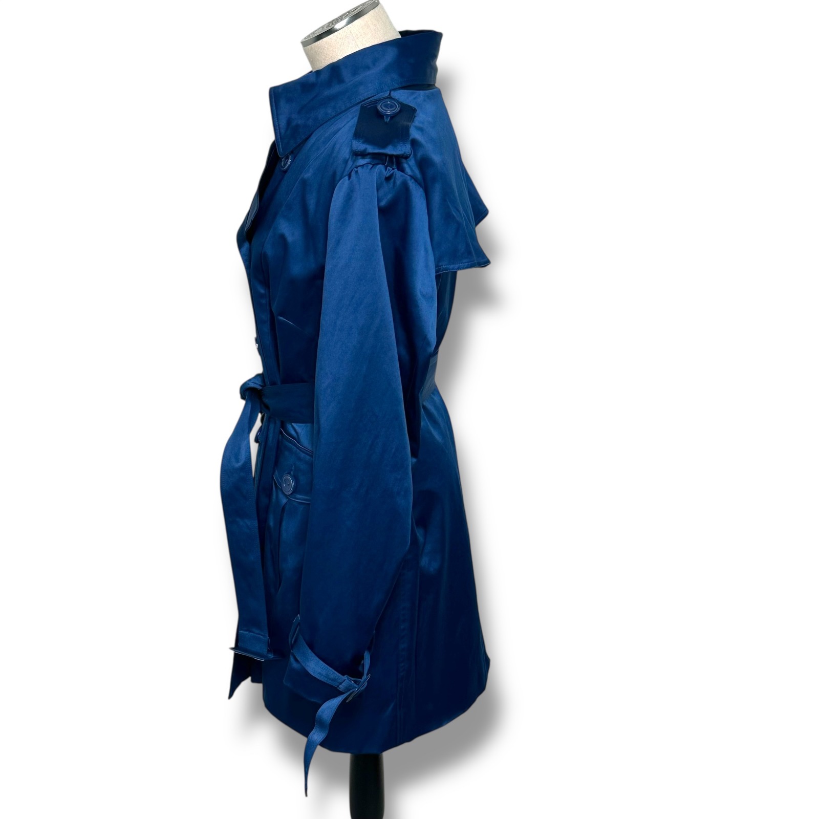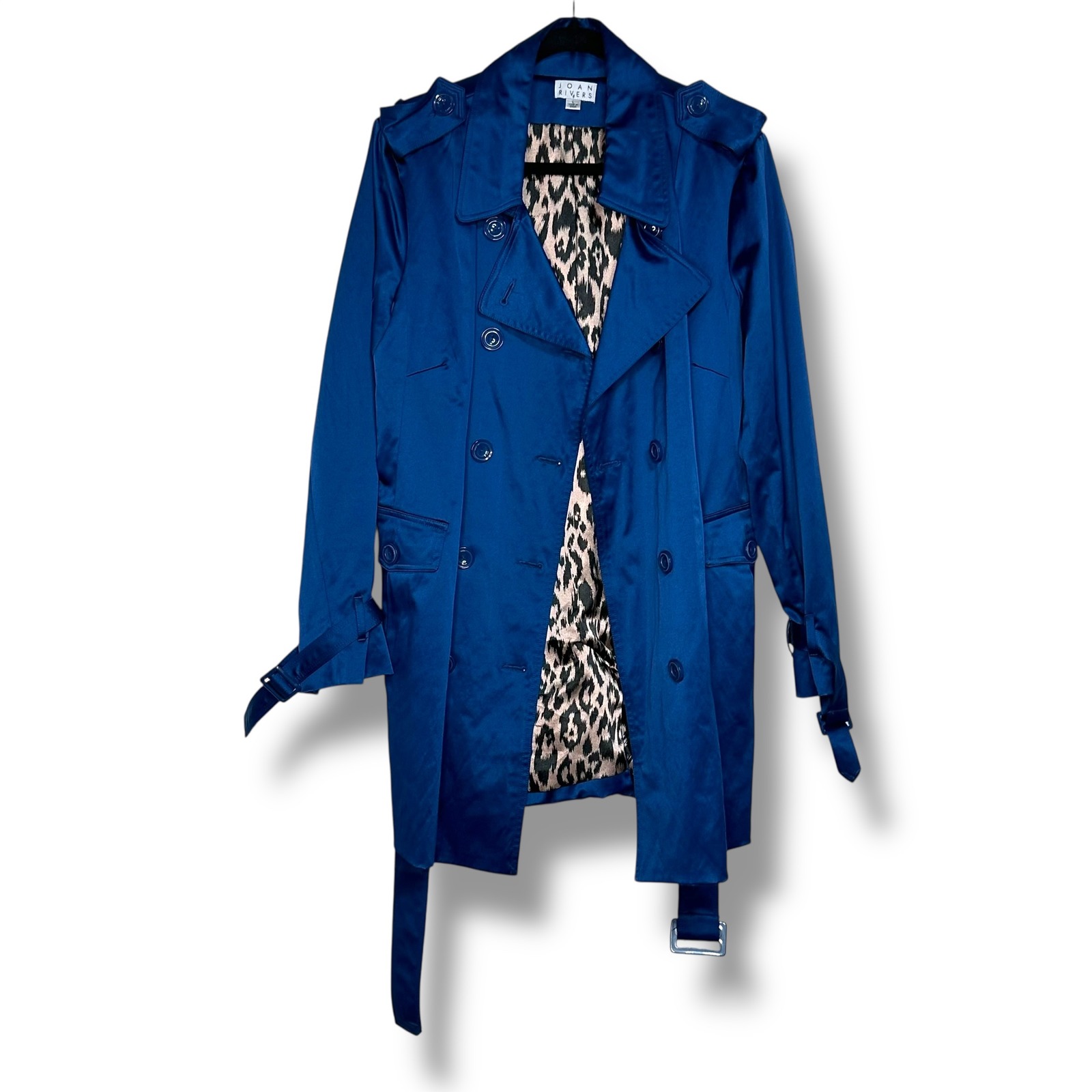 Sophisticated and stylish trench coat in a striking royal blue hue. This eye-catching coat features a classic double-breasted design, complete with a matching belt to cinch the waist and accentuate the figure. Shoulder epaulettes add a touch of military-inspired flair, while the unique leopard print lining brings a playful and unexpected twist. Additional design elements include adjustable straps at the cuffs and functional pockets, blending practicality with high-fashion aesthetics. Ideal for elevating everyday outfits or adding a pop of color to special occasions, this trench coat is a statement piece for cocktail parties, dinner dates, and upscale evening events.