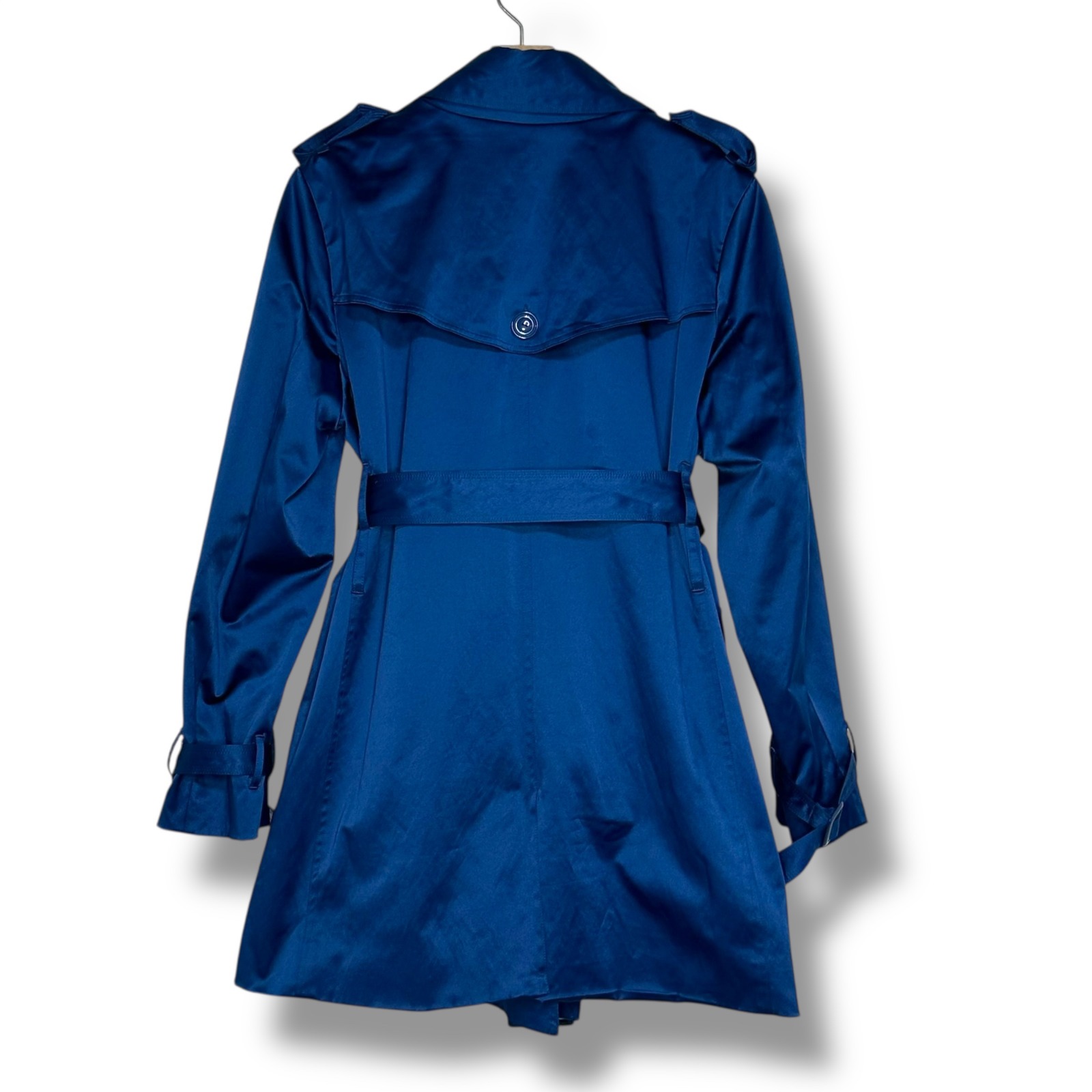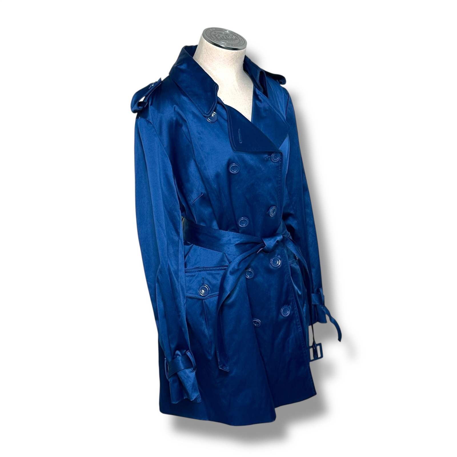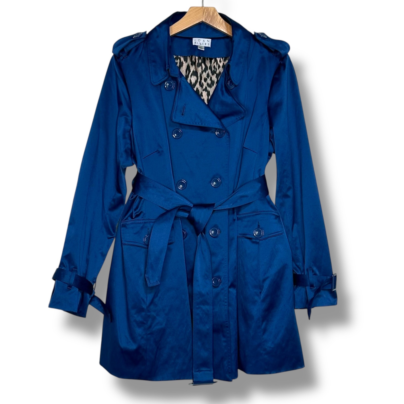 Sophisticated and stylish trench coat in a striking royal blue hue. This eye-catching coat features a classic double-breasted design, complete with a matching belt to cinch the waist and accentuate the figure. Shoulder epaulettes add a touch of military-inspired flair, while the unique leopard print lining brings a playful and unexpected twist. Additional design elements include adjustable straps at the cuffs and functional pockets, blending practicality with high-fashion aesthetics. Ideal for elevating everyday outfits or adding a pop of color to special occasions, this trench coat is a statement piece for cocktail parties, dinner dates, and upscale evening events.