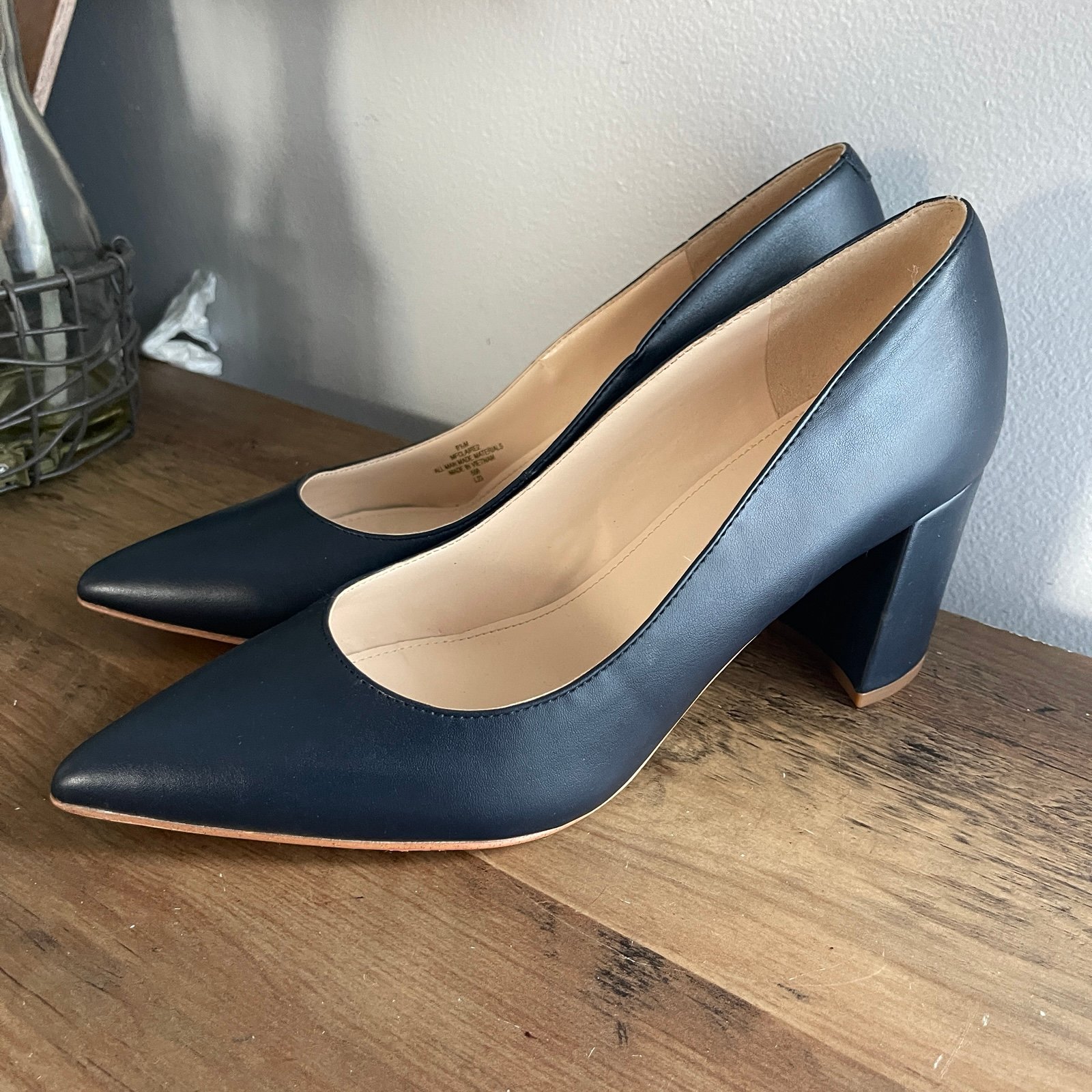 high block heel and fashionable pointy toe. Designed for the modern woman, Marc Fisher. Navy blue color