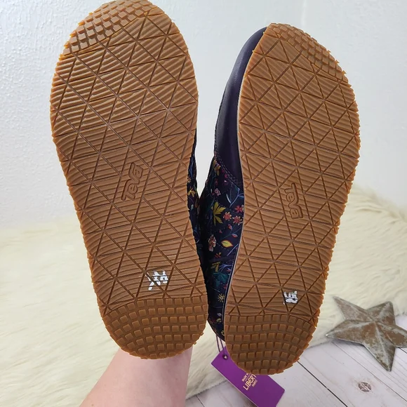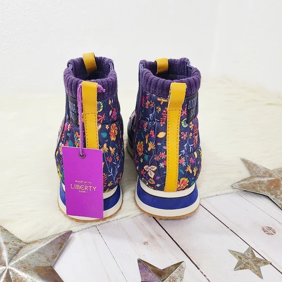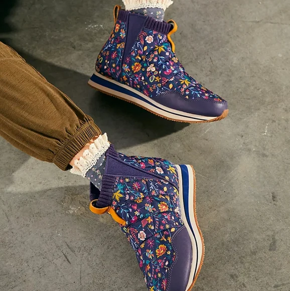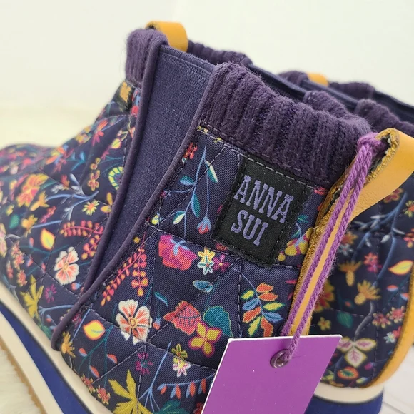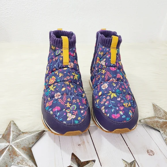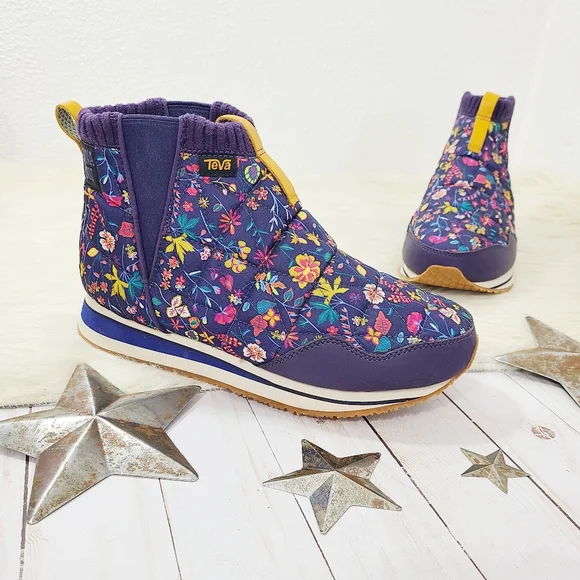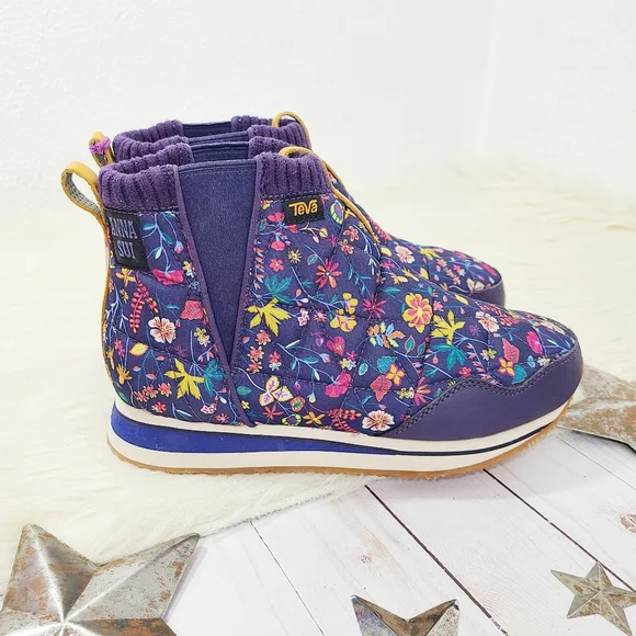 Teva X Anna Sui Ember Mid Anna Boots purchased from Free People.An elevation of comfort-friendly brand Teva’s Ember Mid Boots, this style in collaboration with designer Anna Sui features a bright purple rainbow floral design on the water-repellant upper with a stretch, pull-on fit and ultra cushioned footbed on an EVA-foam midsole for stacked height.- Microfiber lining for added comfort- Leather trimming throughout- Rubber outsole for traction- Purple ribbed knit cuffs- Made with Liberty FabricSize 8These are new without box, NWOB, but do have the Liberty Fabric tag attached.