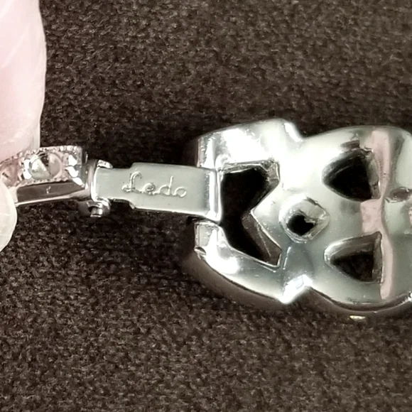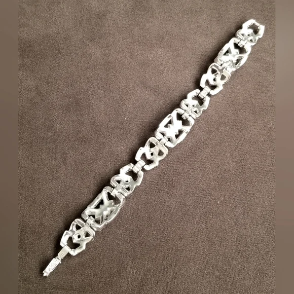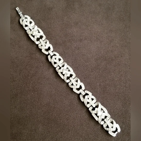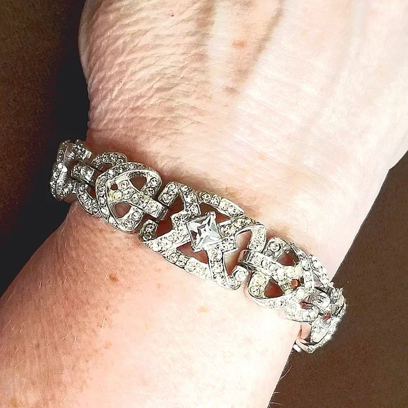 This gorgeous 7" Rhodium Plated Rhinestone Bracelet is a family piece that belonged to a wealthy spinster aunt who passed away almost 50 yrs ago. I have had it put away in a box since I inherited it, and have never worn it. The bracelet is in terrific shape with very little age showing, and the high quality rhinestones are all clear & sparkling. I would call this style "Art Deco" since it fits in with that style of bold, geometric shapes & a sense of luxury. The "Ledo" marking, on the clasp, indicates it was made between 1949 & 1960, which is when the company changed it's logo signature. These beautiful bracelets were all made by hand.Please note...there are no rhiestones in the actual clasp, itself, but it appears it was made this way as there is no residue & the area is clean & shiny. I'm thinking the foldover hidden clasp was designed like this so there would be no stones knocked out when opening & closing the clasp, which closes tightly.Thanks so much for considering my listing!Reasonable offers are always considered. No lowball offers, please.