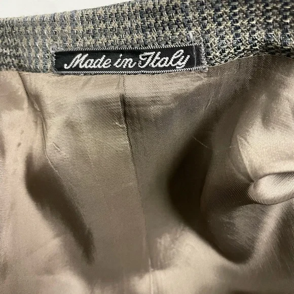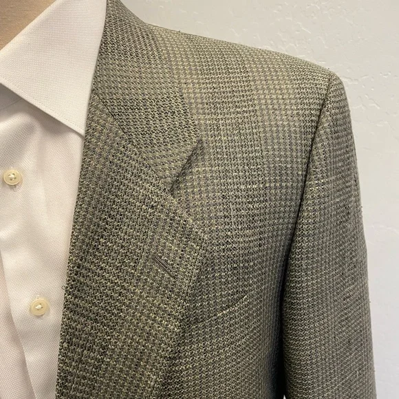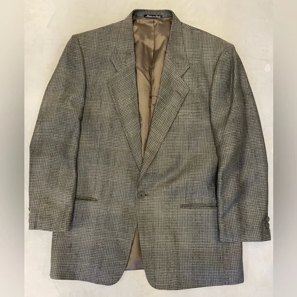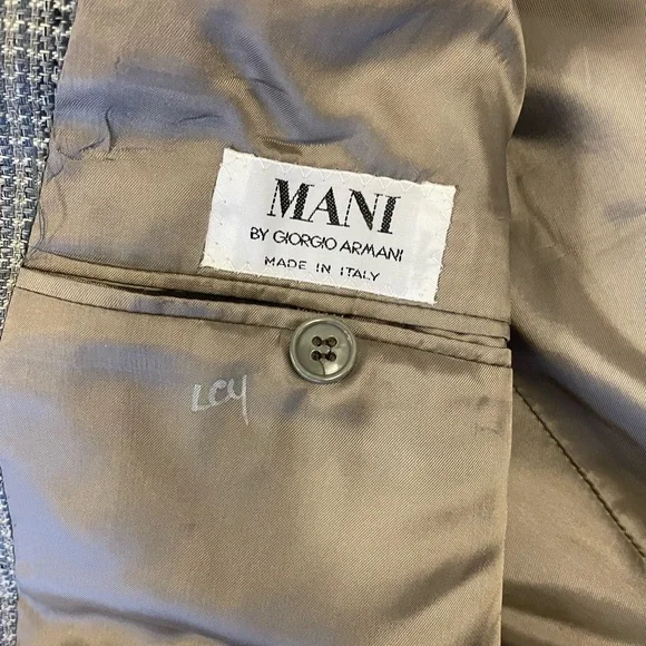 MANIBY GIORGIO ARMANIMade in ItalyVintageIridescent Silk Tweed JacketSize 41 R100% Silk- Single Breasted, Notch Lapel-Signature Single Button Closure- No Vent- Upper Barchetta (Welt) Pocket- Lower Slit PocketsColor Gray (multi)Condition Good to Very good VintageApprox. shoulders 19 1/4” chest 42” length 30” sleeve 33” measured from center of collar sleeve 23” measured from shoulder seam*1 1/2" additional fabric to let out at cuff if needed11-8240.8x10