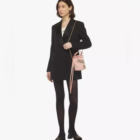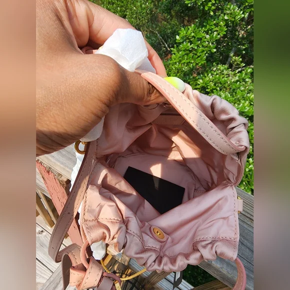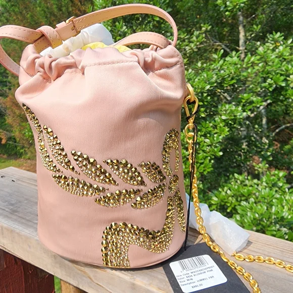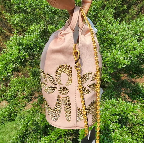 Bucket bag with crystal-embellished MCM logo and natural nappa leather trimThis mini drawstring bag in Italian recycled nylon is graced by rhinestone crystals forming the signature MCM laurel leaves. The adjustable leather shoulder straps can be extended to the wearer’s desired length for optimal comfort.11.0 x 15.5 x 19.5 cmStrap drop: 60 cm, Handle drop: 10 cmAdjustable shoulder strapsLeather top handles